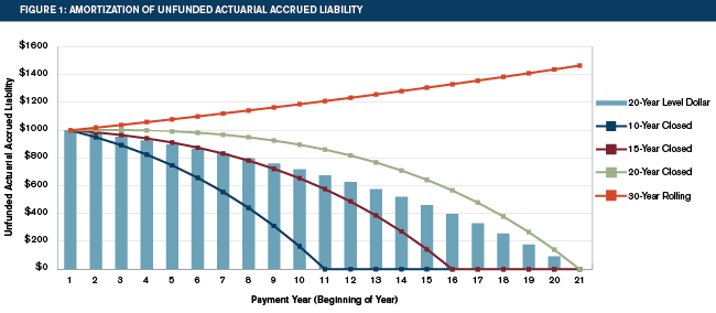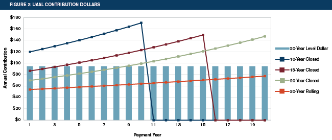 The graphs in Figures 1 and 2 illustrate the amortization of an initial UAAL over time under various amortization methods, as well as the related UAAL contribution dollars.