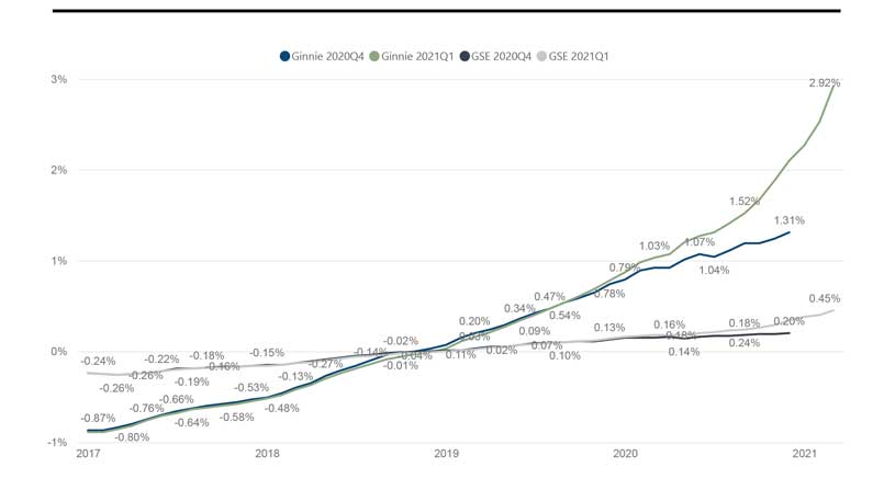 For GSE loans, borrower risk remained consistent at 1.03% in 2021 Q1 relative to 2020 Q4. The continued low level of borrower default risk in 2020 Q4 is attributable to the majority of loans being refinance, which has lower average loan-to-value (LTV) ratios and higher credit scores. For Ginnie Mae loans, borrower risk increased in 2021 Q1 relative to 2020 Q4 from an average of 5.87% to 6.11%. Ginnie Mae loans are generally lower credit score/higher LTV ratio loans.