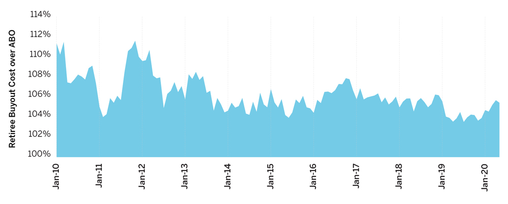 During April, 2020, average accounting discount rates decreased by 56 bps, while annuity purchase rates decreased by 51 bps. This caused the estimated retiree buyout cost as a percentage of accounting liability (Accumulated Benefit Obligation) to decrease from 105.7% to 105.5%.
