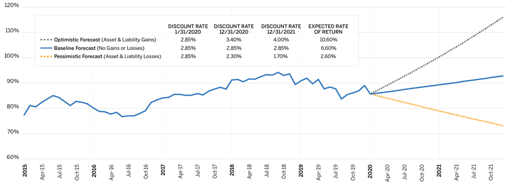 Under an optimistic forecast with rising interest rates (reaching 3.40% by the end of 2020 and 4.00% by the end of 2021) and asset gains (10.6% annual returns), the funded ratio would climb to 99% by the end of 2020 and 116% by the end of 2021. Under a pessimistic forecast with similar interest rate and asset movements (2.30% discount rate at the end of 2020 and 1.70% by the end of 2021 and 2.6% annual returns), the funded ratio would decline to 80% by the end of 2020 and 73% by the end of 2021.