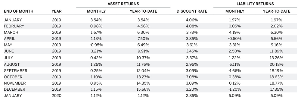 The market value of assets grew by $14 billion as a result of January’s robust investment gain. The Milliman 100 PFI asset value increased to $1.633 trillion at the end of January. By comparison, the 2019 Milliman Pension Funding Study (PFS) reported that the monthly median expected investment return during 2018 was 0.53% (6.6% annualized). The expected rate of return for 2019 will be updated in the 2020 Milliman Pension Funding Study, due out in April.