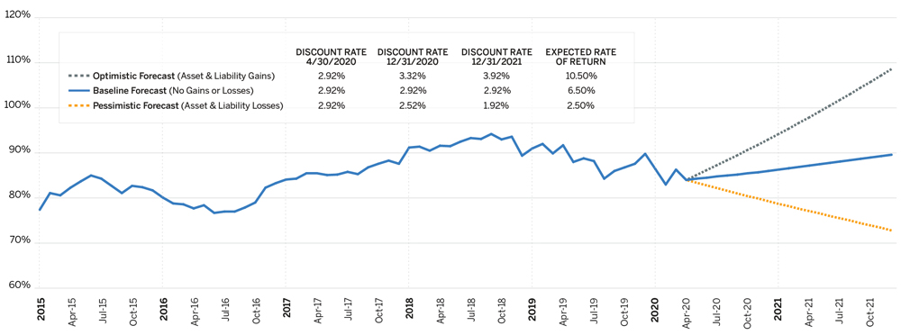 Under an optimistic forecast with rising interest rates (reaching 3.32% by the end of 2020 and 3.92% by the end of 2021) and asset gains (10.5% annual returns), the funded ratio would climb to 93% by the end of 2020 and 109% by the end of 2021.