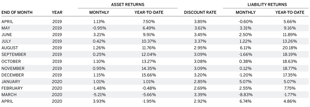 Over the last 12 months (May 2019 – April 2020), the cumulative asset gain for these pensions has been 5.49% and the Milliman 100 PFI funded status deficit has grown by $159 billion. The primary reason for the worsening of the funded status deficit has been a decline in discount rates over the past 12 months. During that period, discount rates decreased, moving from 3.85% as of April 30, 2019, to 2.92% as of April 30, 2020. The funded ratio of the Milliman 100 companies has decreased significantly over the past 12 months, to 84.0% from 91.7%.