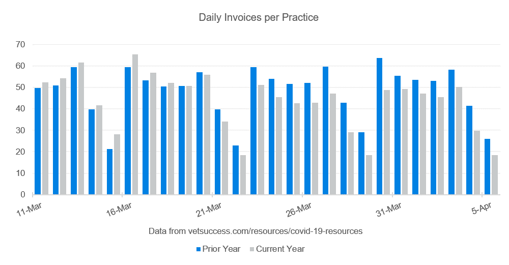 All of the above would seemingly point to fewer visits to the vet. In fact, data compiled by VetSuccess from more than 2,500 veterinary practices in the United States shows that, from March 25 through April 5, the number of daily veterinary invoices have fallen nearly 19% year over year. As shown in Figure 1 below, daily invoices had actually been slightly higher than last year in the weeks prior. Daily revenue data shows a similar pattern, down about 16% year over year.