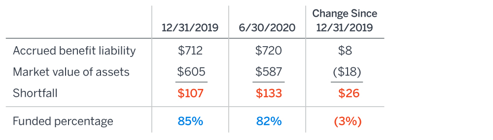 - The aggregate funded percentage for multiemployer plans is estimated to be 82% as of June 30, 2020, down from 85% at the end of 2019.