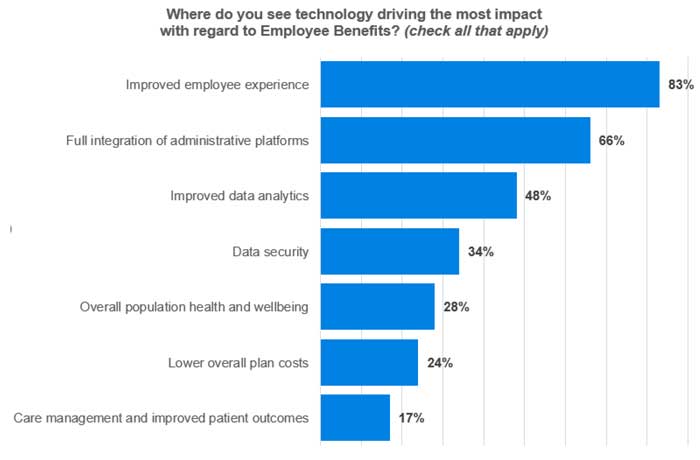 Responses to the survey indicate a desire to improve the overall employee experience, including enhancing employee health and well-being (e.g.) telemedicine or wellness tracking. At the same time, there is clear concern over user adoption – translating to a need for an integrated solution that is easy for employees to use and understand.