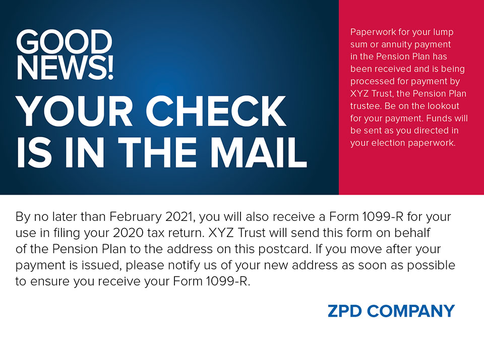 Confirmation Postcard Sample Informs participants that payments are on the way. |