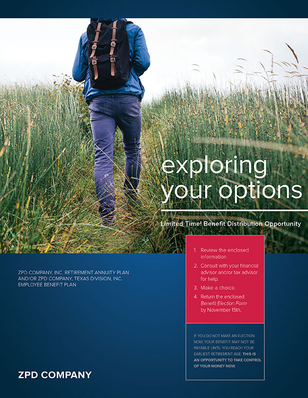 - 9” x 12” carrier envelope branded with client’s logo and including a tagline to draw attention to the contents: “Important Retirement Information Enclosed – Immediate Action Required”